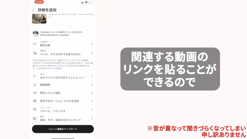 例えば、すでに投稿しているロング動画を一部抜粋してショート動画にした場合、関連動画のところにそのロング動画を設定して「続きはこちら」と回遊を促すことができます。